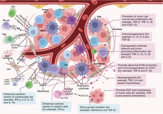 肿瘤微环境图显示了代表性的细胞类型、信号转导因子和各种细胞因子,以及它们的作用机制。在肿瘤部位,免疫细胞通常会获得与肿瘤相关的免疫抑制表型,但杀死癌细胞的细胞毒性CD8淋巴细胞(CTL)除外。髓源性抑制细胞(MDSC)通过各种机制抑制免疫。MDSCs还可以诱导T调节细胞(Treg)抑制自然杀伤(NK)细胞,并促进具有2 型表型的肿瘤相关巨噬细胞(TAM)。成纤维细胞变成癌症相关成纤维细胞(CAF),促进细胞外基质(ECM)重塑。各种细胞释放的细胞外囊泡含有影响微环境的蛋白质、mRNA和microRNA。纤维化细胞因子募集免疫细胞。中性粒细胞受刺激后释放的中性粒细胞胞外陷阱(NET)可以捕获癌细胞。TAMs、TAN和CAF释放血管生成细胞因子和基质金属蛋白酶(MMP),促进血管生成和ECM降解,并促进潜在的转移。此外,细胞因子的作用,用红色(促进肿瘤)和蓝色(抗肿瘤)矩形表示。一些细胞因子,如转化生长因子-β(TGF-β),可以产生双重作用,根据情况既作为抗肿瘤因子,又作为肿瘤促进因子。研究结论