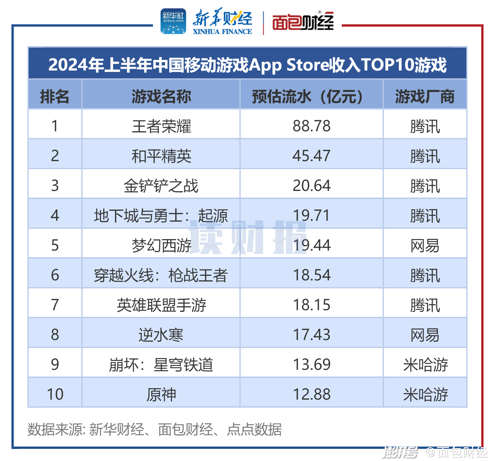 点点数据显示,在2024年上半年中国移动游戏App Store收入TOP10游戏中,腾讯旗下游戏达到6款,网易和米哈游各占2款。