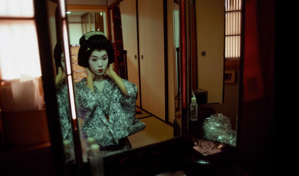京都宫川町艺伎区,一名年轻的艺伎正在对着镜子整理自己的假发。© Jodi Cobb利维坦按: