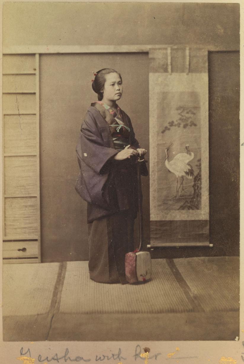 19世纪80年代,一名手持三味线的艺伎。艺妓和舞伎通常用三味线演奏音乐。© Charles Harris Phelps