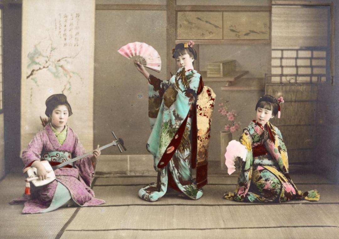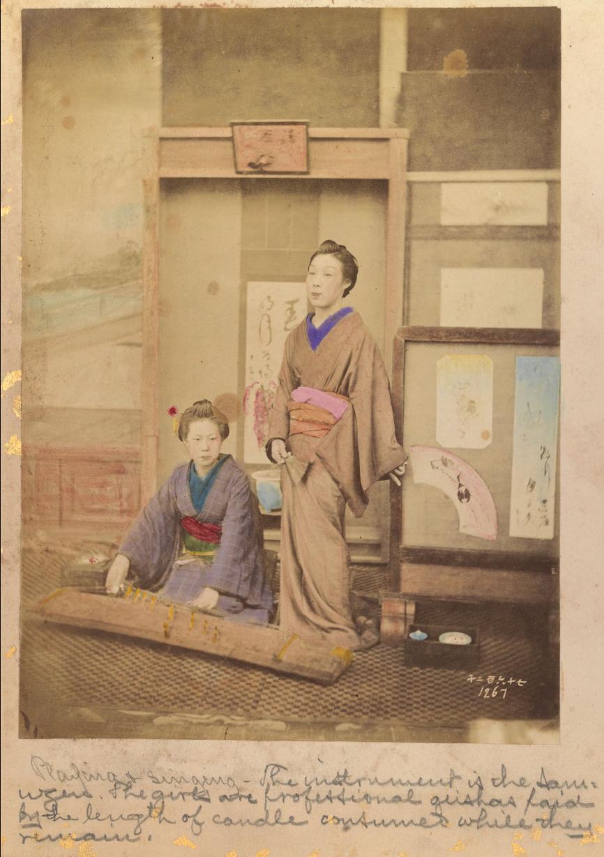 19世纪80年代,艺伎通过弹琴和唱歌来招待客人。© Charles Harris Phelps