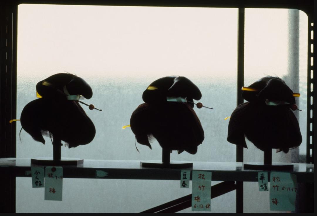 艺伎所戴假发被称为“鬘”(かつら,katsura,“鬘”在古汉语里本义指美丽发式,没有假发之义,日语把假名“かつら”写成汉字“鬘”)。© Jodi Cobb这些机构不仅需要食材来制作完整的菜单,为常客和游客提供服务,还需要工匠来协助维护传统风格的建筑,例如榻榻米制造者和熟练的木匠。同样,艺伎也需要工匠来为她们提供行业必需品,例如精致的和服和各种配饰。