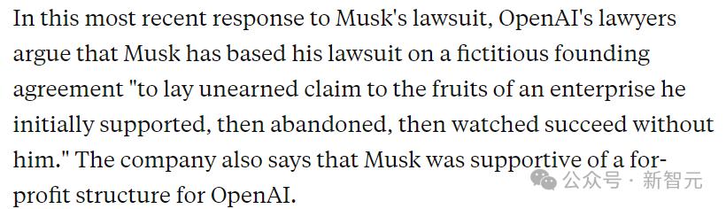 在对马斯克诉讼的最新回应中,OpenAI的律师辩称,马斯克的诉讼是基于一份虚构的创立协议,目的是「不劳而获地索取他最初支持、后来抛弃、然后在没有他的情况下取得成功的企业的成果」。OpenAI还表示,马斯克支持OpenAI的营利性结构。在最初的诉讼之后的3月份博文中,奥特曼和其他OpenAI高管发布了电子邮件,声称马斯克一直支持向营利性地位转变,并表示,「我们很遗憾,曾经深感荣幸的合作伙伴却走到了这一步。」
