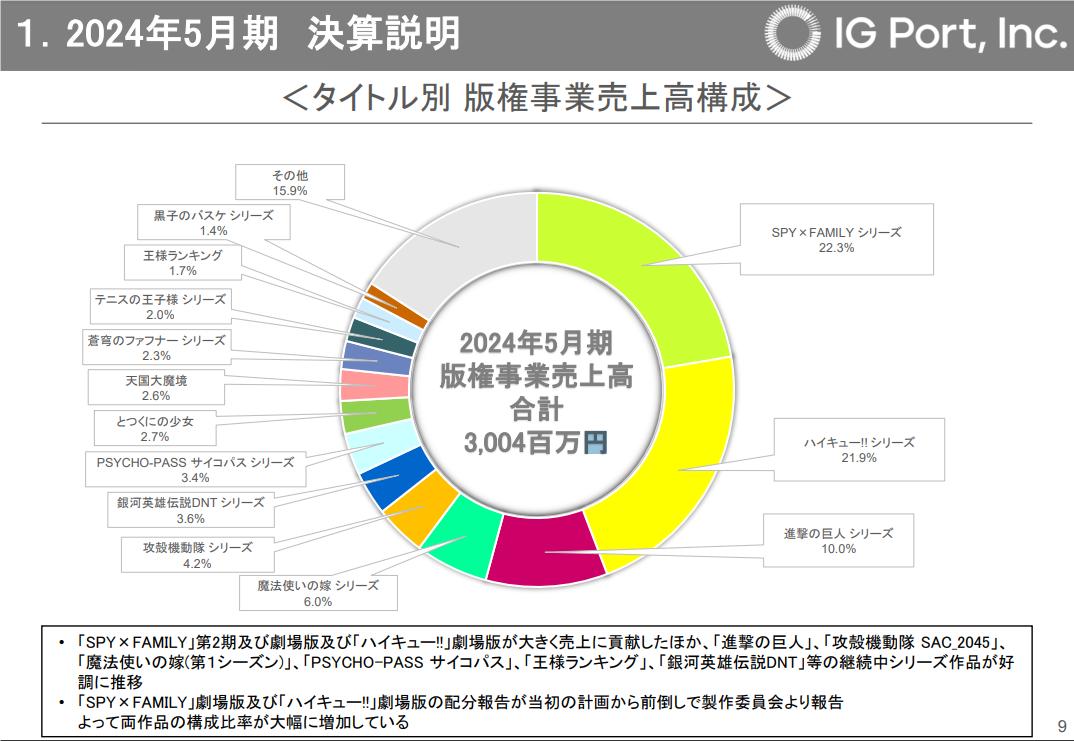 这些合作与收购的通稿几乎都提到了这些目标:强化制作能力,促进 IP 创造。再结合IG Port(Production.I.G、WIT STUDIO 等公司的母集团)最新财报,会发现这家此前以影像制作为核心业务的公司如今在版权业务实现了大幅度增长,尤其是《间谍过家家》《排球少年!!》的版权业务最为亮眼。