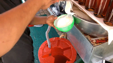 巴扎上的沙朗刀客摊子通常不大,硕大的冰块占据C位,下单之后,老板手拿冰凿从整冰上,均匀的凿出一碗碎冰,加一勺酸奶,一点糖稀,再用手晃动几圈就算制作完毕,可以直接拿走,也能坐在长条凳上喝完。遇到喜欢炫技的老板,用手晃动的步骤会被将沙朗刀客抛向空中再接住替代,如此反复几次力求酸奶、碎冰和糖稀充分混合均匀。