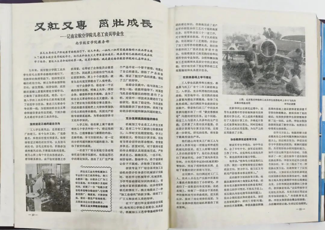 《航空知识》第五届编委会上(1995年3月),第一任主编沈元院士和第二任主编谢础亲切交谈非常巧合的是,《航空知识》第一期,就有一篇专门介绍南京航空学院工农兵学员事迹的文章。那篇文章的配图用的北京航空学院的照片,但我当时并没有注意到,这是后来才知道的。也可能是谢础先生是北航毕业的,曾在北航工作过。又在北航办《航空知识》,获得图片资料比较方便的原因,所以用上了北航的照片作为配图。《航空知识》是月刊,1974年12期中,只有第一期有文章介绍了南航,再没有专门介绍其他航空院校的文章。所以,从此南京航空学院就给我留下了十分深刻的印象。