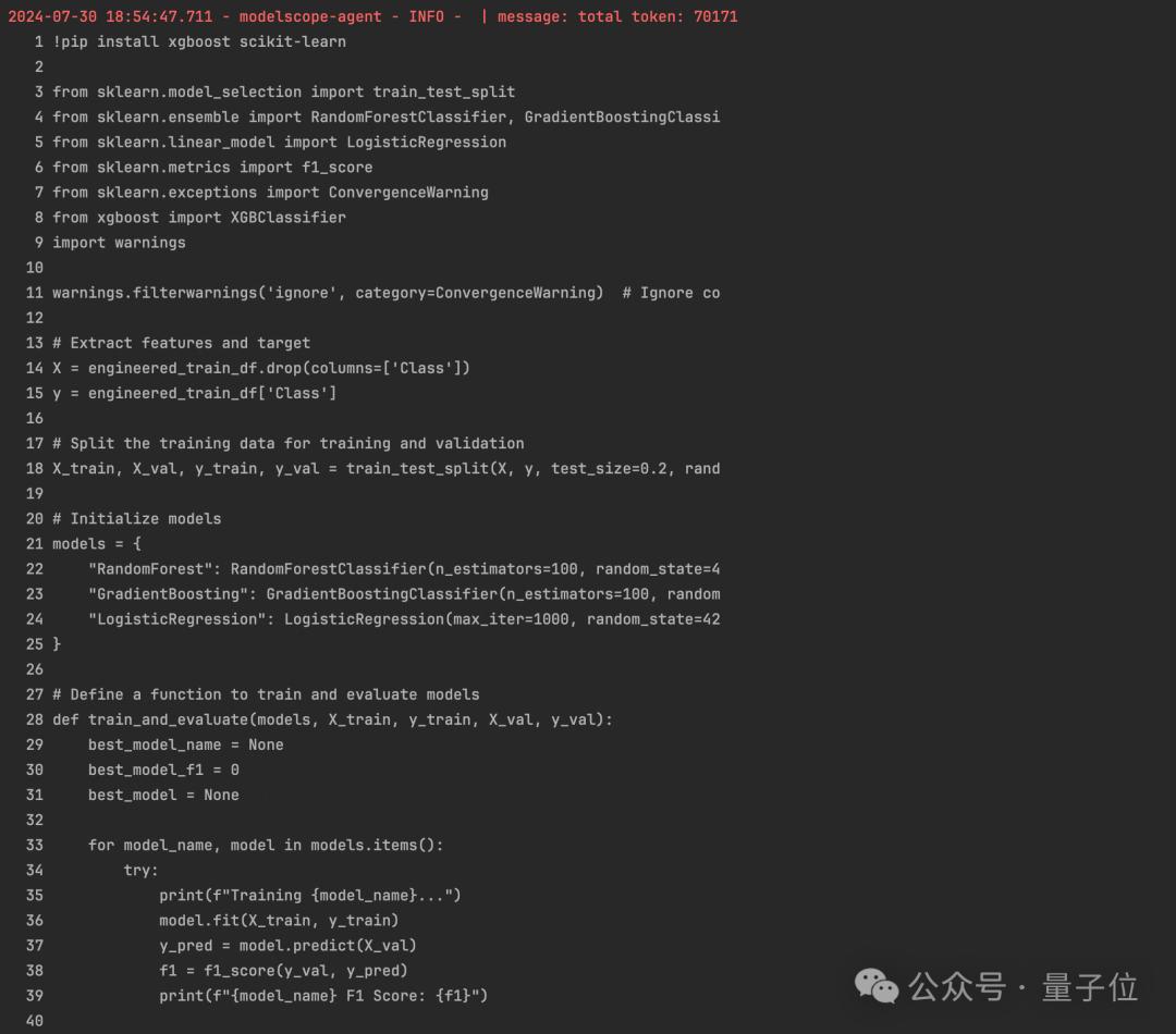 Task 4:模型训练DS Assistant主动安装了合适的依赖,并选择了多个模型(随机森林,梯度提升,逻辑回归)进行训练,并选择了结果最好的模型。