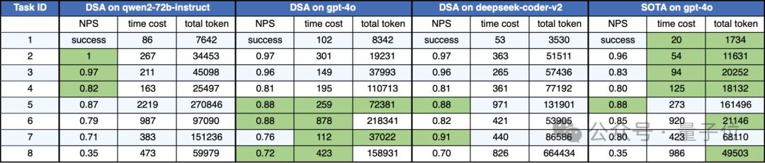 可以看到,在部分复杂的数据科学任务上,DS Assistant在规范化性能得分(NPS),任务时间,消耗token数的指标上取得超过开源SOTA的效果。(其中开源SOTA效果指MetaGPT实测值)完整实验日志:https://modelscope-agent.oss-cn-hangzhou.aliyuncs.com/resources/DS_Assistant_results.zip