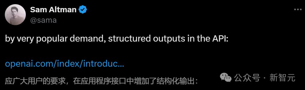 一直以来,结构化输出功能是开发人员呼声最高的头号功能,奥特曼在推文中也表示,该版本是应广大用户的要求发布的。