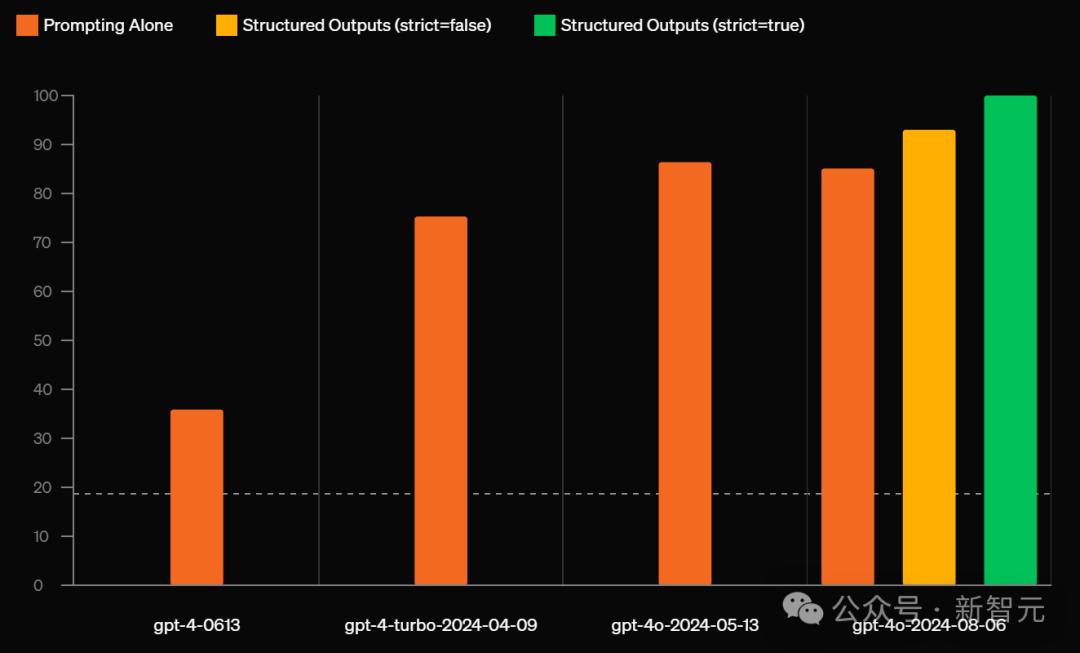 在对复杂的JSON schema的跟踪评估中,带有结构化输出的新模型gpt-4o-2024-08-06获得了100%的满分。相比之下,gpt-4-0613的得分不到40%。