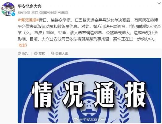 近日,接群众举报,在巴黎奥运会乒乓球女单决赛后,有网民在微博平台发表诋毁运动员和教练员信息。对此,警方迅速开展调查,将犯罪嫌疑人贺某某(女,29岁)抓获。经查,该人恶意编造信息、公然诋毁他人,造成恶劣社会影响。目前,大兴公安分局已依法将贺某某刑事拘留,案件正在进一步侦办中。