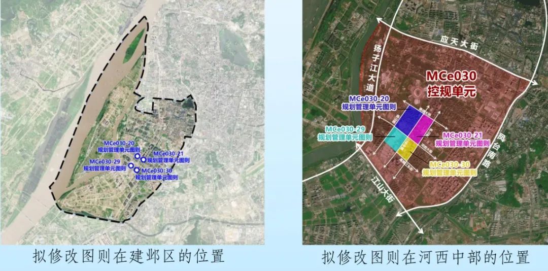 地块位置。MCe030-20、21、29、30规划管理单元图则位于建邺区河西中部地区,其中,20单元东至江东中路、西至燕山路、南至河西大街、北至奥体大街,用地面积约46.36公顷;21单元东至庐山路、西至江东中路、南至河西大街、北至奥体大街,用地面积约33.94公顷;29单元西至燕山路、东至江东中路、北至河西大街、南至南京国际博览中心,用地面积约35.68公顷;30单元东至庐山路、西至江东中路、北至河西大街、南至嘉陵江东街,用地面积约24.85公顷。