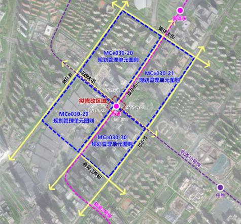 拟修改区域在MCe030-20、21、29、30规划管理单元的位置。元通地铁站是