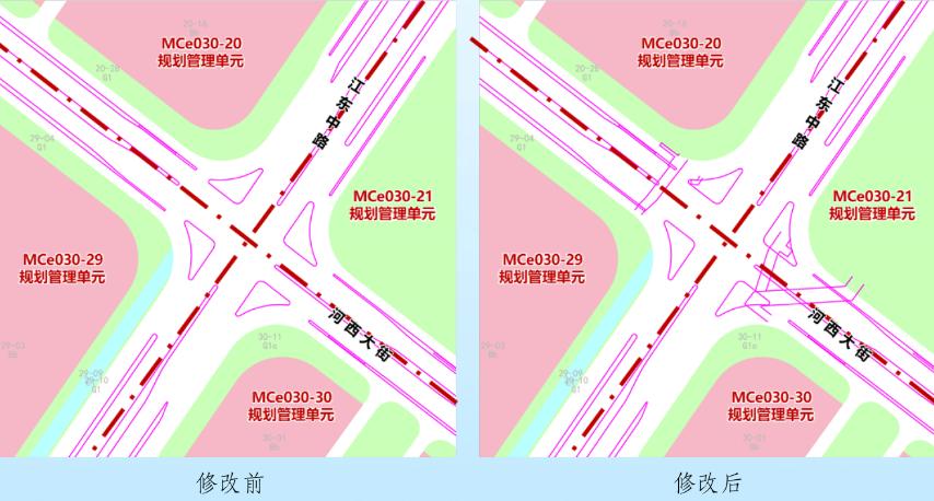 修改前后对比图。从规划图上看,地下新增华采天地到南京国际博览中心1号馆旁的地下通道,ifc地下则与对面的河西中央公园之间增加两条地下通道。