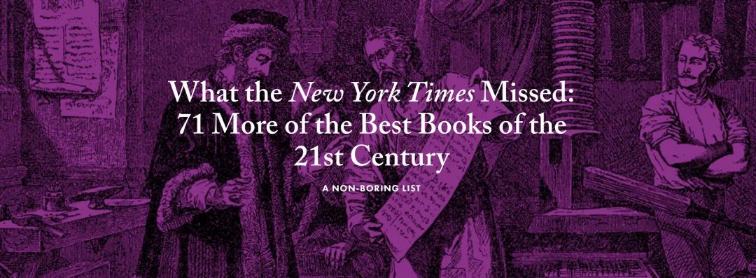 《纽约时报书评周刊》近期公布了“21世纪100本最佳图书”榜单。文学网站Lithub点评道:“为什么不直接称之为过去二十余年最佳图书呢?他们是不是知道一些我们不知道的事情?”在Lithub看来,《纽约时报》“令人震惊地”遗漏了大量书籍,比如除了《公民》以外的所有诗集。另外,《纽约时报》也“(粗鲁地)没有询问Lithub团队的成员”,因此他们决定列出被遗漏的71本书籍,并将之称为“一份不无聊的清单”。书单中包括C.D.赖特的诗集《与他者在一起》、特德·姜的科幻小说集《你一生的故事》、裘帕·拉希莉的《同名人》、大卫·福斯特·华莱士的《思考龙虾》、村上春树的《海边的卡夫卡》、燕妮·埃彭贝克的《客乡》、卡尔·奥韦·克瑙斯高的《我的奋斗》、柳原汉雅的《渺小一生》、托尔卡丘克的《航班》等。FineBooks&Collections网站