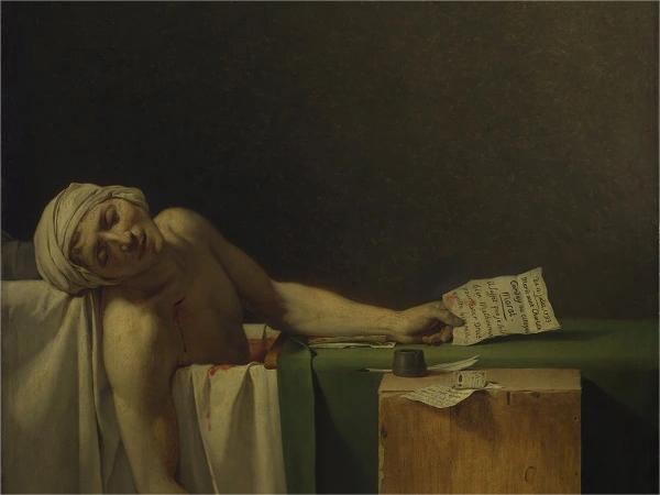 雅克-路易·大卫《马拉之死》(局部)维克多·雨果的长篇小说《悲惨世界》问世于1862年,小说的时代背景在1815年至1832年间——贫民阶层不得不生活在臭气熏天的下水道中,处境悲惨,以至于在1825年至1852年间共发起了九次起义。