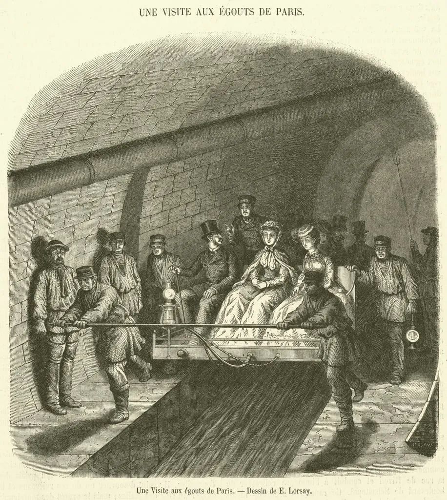 巴黎的集成式下水道,19世纪70年代。为了清理这种集成式下水道,还特别设计了一种大清沙船和小清沙车,它们能够沿着每条下水道的中心管道行进,一路将水中沉积的所有垃圾向前推进。宽阔的空间,可以移动的车船,为下水道旅游埋下伏笔——奥斯曼的下水道在设计之初就将供人参观纳入考量,各条下水道中均标有地面上对应的街道名称。在1867年巴黎世界博览会期间,奥斯曼策划了下水道参观项目,每天可供四百名游客坐着小船或小车游览下水道,其他游客则可以沿着两侧的走道参观,“下水道干净整洁,即使女士穿着干净美丽的裙子在地下从卢浮宫走到协和广场,也不会弄脏裙子”。下水道由煤气灯照明(奥斯曼不喜欢电力),葡萄牙国王路易一世与俄国沙皇亚历山大二世都曾来此参观,后者更是由奥斯曼和贝尔格朗亲自导览。参观下水道逐渐成了巴黎的一项日常休闲活动。1894 年,一位参观者将大清沙船形容为“一艘名副其实的贡多拉,铺着地毯,有软垫座椅,还有巨大的煤气灯照明,可能没有威尼斯的贡多拉那么精美,却要明亮许多”。