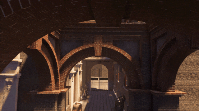 大空间VR场景—石库门第二个逻辑是视觉体验逻辑,①开阔场景:外滩;②演员表演:游行、一大会议;③狭窄空间:石库门;④舞台空间:工人运动;⑤上升空间:博文女校、马克思主义传播意象空间;⑥巨人模式:光荣之城。