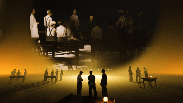 舞剧《永不消逝的电波》这是一幕展现工人阶级觉醒的场景。为了烘托氛围,我们塑造了光亮照破黑暗的舞台效果。舞台上的每个小桌子都富有象征意义,它们代表着一组组工人学校。在这些学校里,共产党人深入到工人群众之中,耐心地引导他们,启发他们的觉悟。从此,中国工人阶级在自己政党的领导下,揭开了开展工会运动和工人运动的新篇章,书写了崭新的历史。这一幕场景要特别感谢美术组的李博霖。