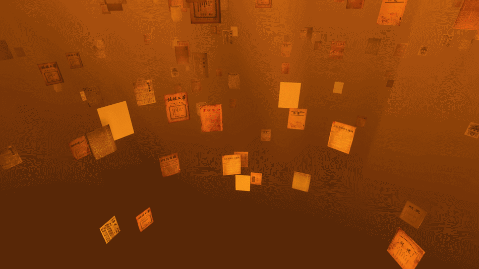大空间VR设计稿—工人运动定稿图第四类场景来源于展览人挥之不去的空间自由梦想,也就是展品超越物理限制,自由在空间中陈列。这是中共一大纪念馆中“主义的抉择”展项中的设计,设计师希望把那些书悬浮在观众面前。当然这些在虚拟空间中太容易实现了。