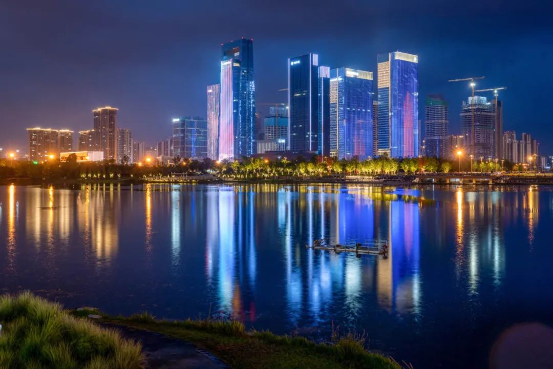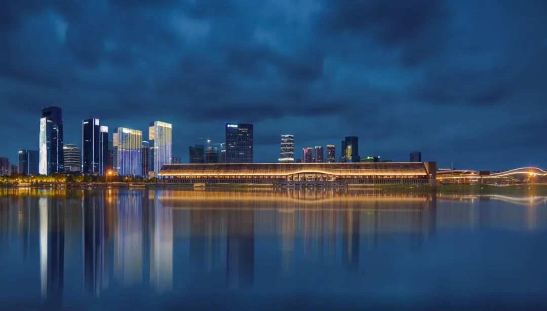 ↑ 组图:夜色下的天府国际会议中心和秦皇湖丨马骥 摄(未经授权 请勿转载)