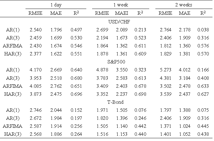 Corsi(2009)利用异质性自回归模型对美元对瑞朗外汇、标普500期货和30年美元国债的收益率进行分析。他们利用最小二乘(OLS)和Newey-West调整方法得到回归参数。并且与自回归模型进行比较,并且测试了该模型的样本内预测表现以及样本外预测: