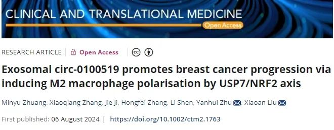 【导读】乳腺癌是威胁全球女性健康的最常见的恶性肿瘤之一。研究表明,circRNAs在调控肿瘤进展和肿瘤微环境(TME)重塑中发挥重要作用。8月6日,南京医科大学研究团队在期刊《Clinical and Translational Medicine》上发表了题为“Exosomal circ-0100519 promotes breast cancer progression via inducing M2 macrophage polarisation by USP7/NRF2 axis”的研究论文,本研究中,研究人员发现Circ-0100519在BC肿瘤组织中显著富集,并与不良预后相关。它可以被包裹到分泌的外泌体中,从而通过诱导m2样巨噬细胞极化促进BC细胞的侵袭和转移。在机制上,circ-0100519作为支架增强巨噬细胞中去泛素化酶泛素特异性蛋白酶7 (USP7)和核因子样2 (NRF2)之间的相互作用,诱导USP7介导的NRF2去泛素化。此外,HIF-1α可以作为上游效应因子增强circ-0100519的转录。本研究表明外泌体circ-0100519是乳腺癌诊断和预后的潜在生物标志物,HIF-1α抑制剂PX-478可能为乳腺癌提供治疗靶点。