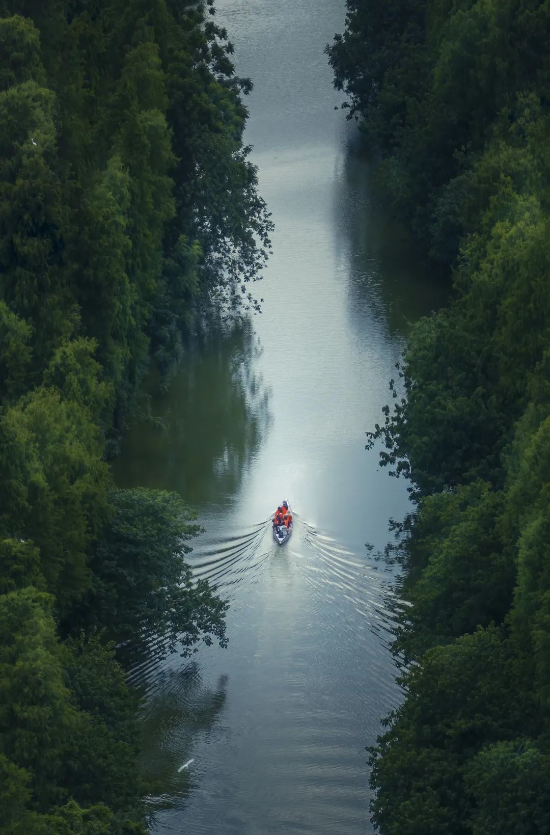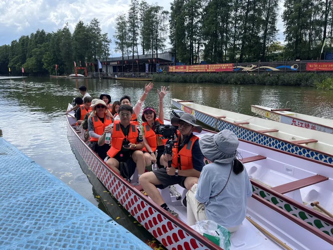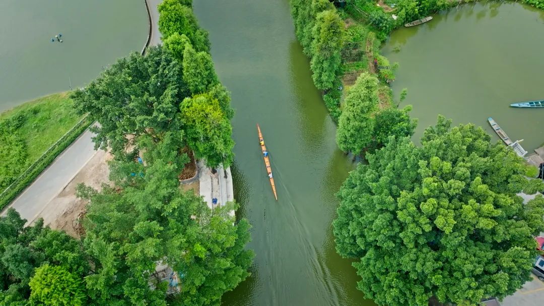 ● 龙舟划过九江璜矶水道的水面,泛起一层层涟漪。水纹、龙舟、白鹭、两岸的杉木共同享受着夏日的宁静。