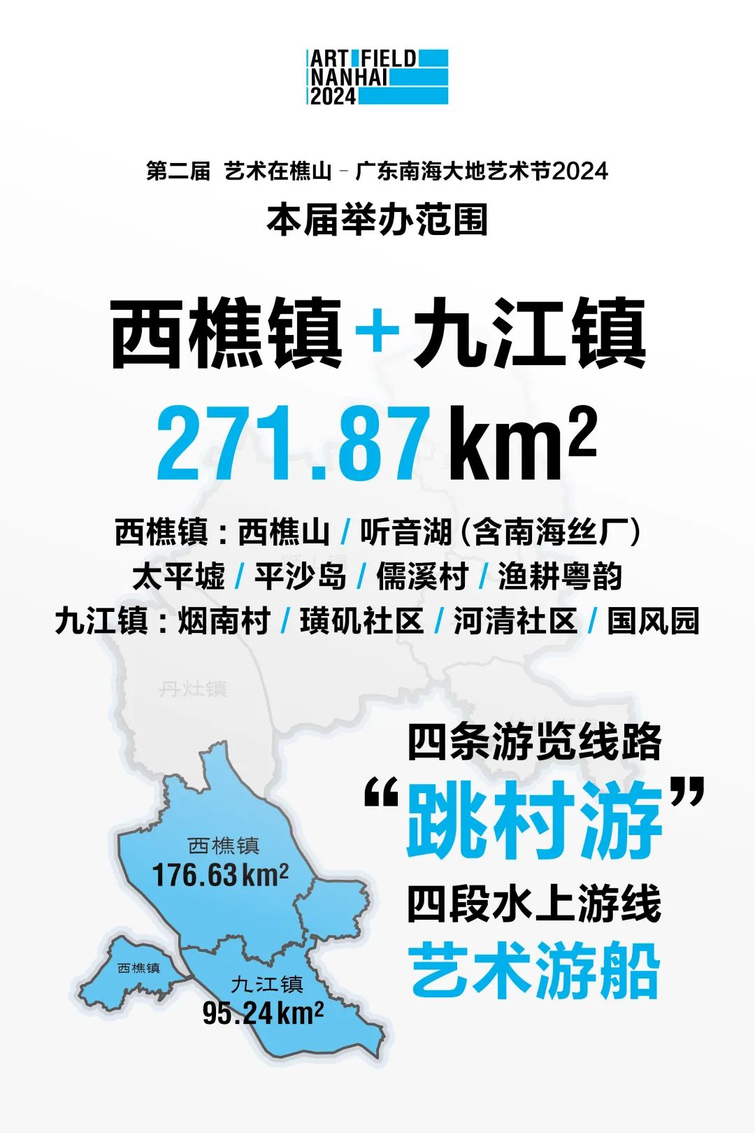 第二届艺术节继续加强全域性布局,举办范围从西镇延伸扩展至九江镇,覆盖地域面积达到271.87平方公里(西樵镇176.63平方公里+九江镇95.24平方公里)。计划以“跳村游”的方式,将西樵镇的西樵山、听音湖(含南海丝厂)、太平墟、平沙岛、儒溪村、渔耕粤韵,和九江镇的烟南村、璜矶社区、河清社区、国风园,共10个区域串点连线,梳理设定为4条游览线路,同时与“水上南海”水交通线路规划进行叠加设计突出重点体验段,创新开发4段艺术游船水上游线,在西樵与九江分别针对性开辟“听音湖-儒溪村-渔耕粤韵”“听音湖-太平墟”艺术画坊游线,以及“烟南烟桥-烟南兴贤”“璜矶向北-河清-璜矶东社”艺术龙舟游线,为观众游客增强风土接触、提升观览体验。