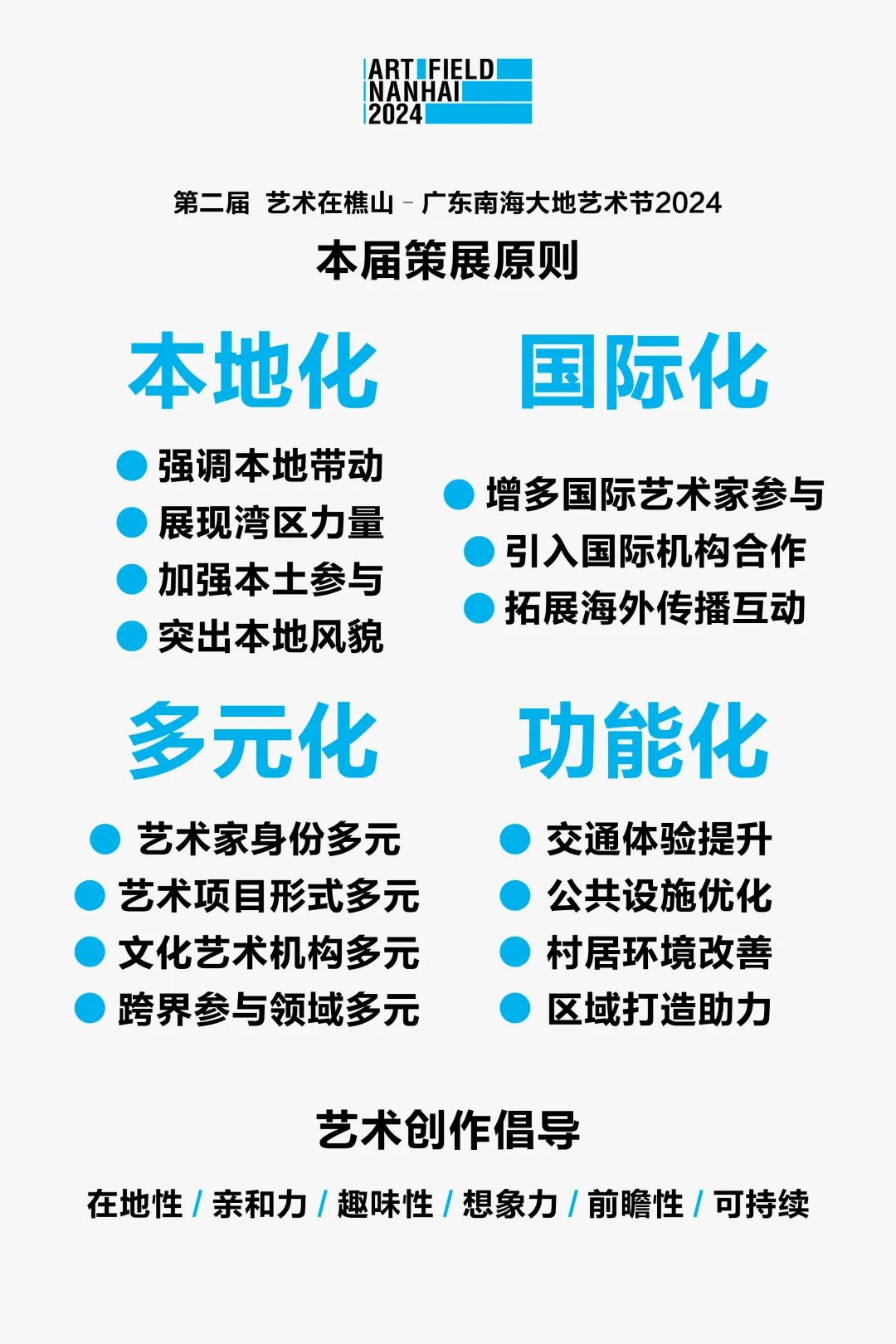同时,本届艺术节在艺术创作上倡导:在地性、亲和力、趣味性、想象力、前瞻性、可持续。在地性包括:创作者亲历现场、讲述本地故事、运用本地材料与技艺、融入本地智慧、邀请本地人共创;亲和力包括:作品应面向公众、尽量适合全年龄段、创作语言应充分尊重当地、加强对老幼群体的人文关怀、传达简单的美好、提供舒服愉悦的感受;趣味性包括:注重互动性、鼓励结合科技、强调体验趣味、以人为本触达五感;想象力包括:突破惯性创作语言、因地制宜善用空间、激发跨维呈现;前瞻性包括:以应对问题为思考、探索新颖创作方法、追求对现状的改变、启迪心智引领青年;可持续包括:优先旧物利用、提倡简朴注重环保、鼓励手工、预设循环使用。