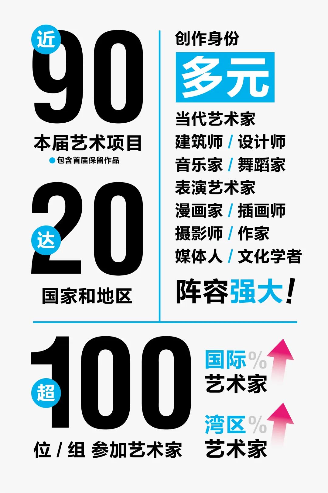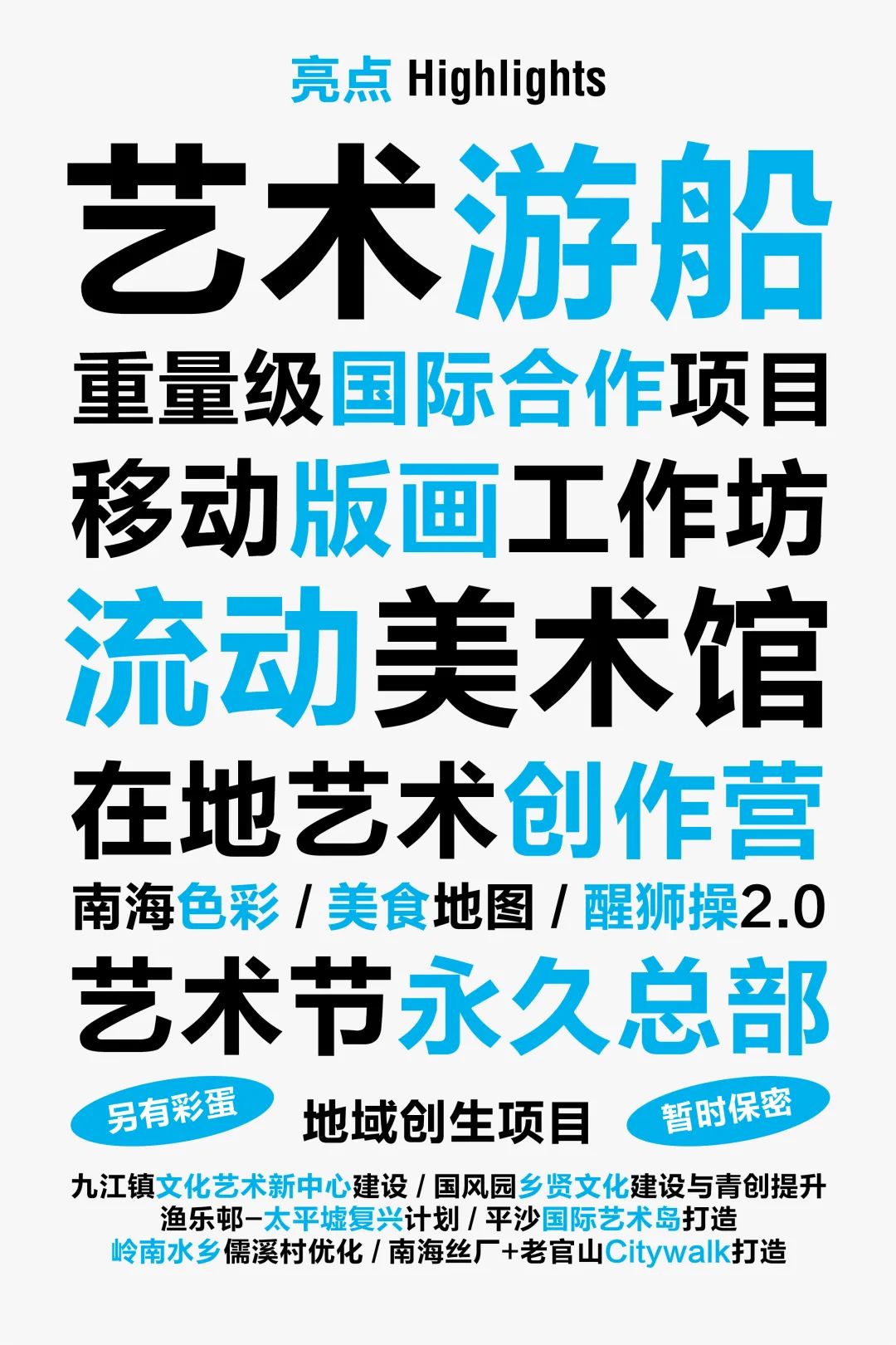 截至目前,艺术节策展工作已结束,艺术创作阶段正在进行,欢迎南海本地企业积极参与共创;完整艺术家名单和主要艺术方案,将在后续阶段性公布;本届艺术节规模范围大、数量多,完整舒适观赏至少需要3天及以上,建议热爱艺术节的观众游客朋友们,提早规划好时间,初秋时节南方尚暖、跨年时段度假舒适、粤味春节风情火热,都是很好的选择。更多信息动态、观览和旅游指南将逐步公布,敬请期待!