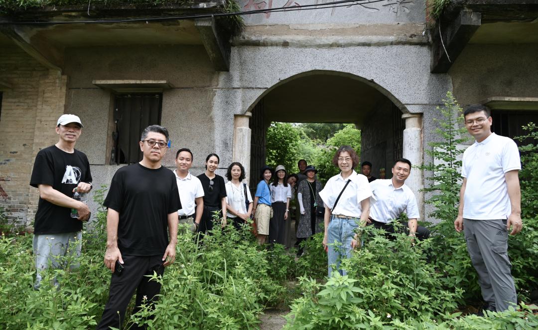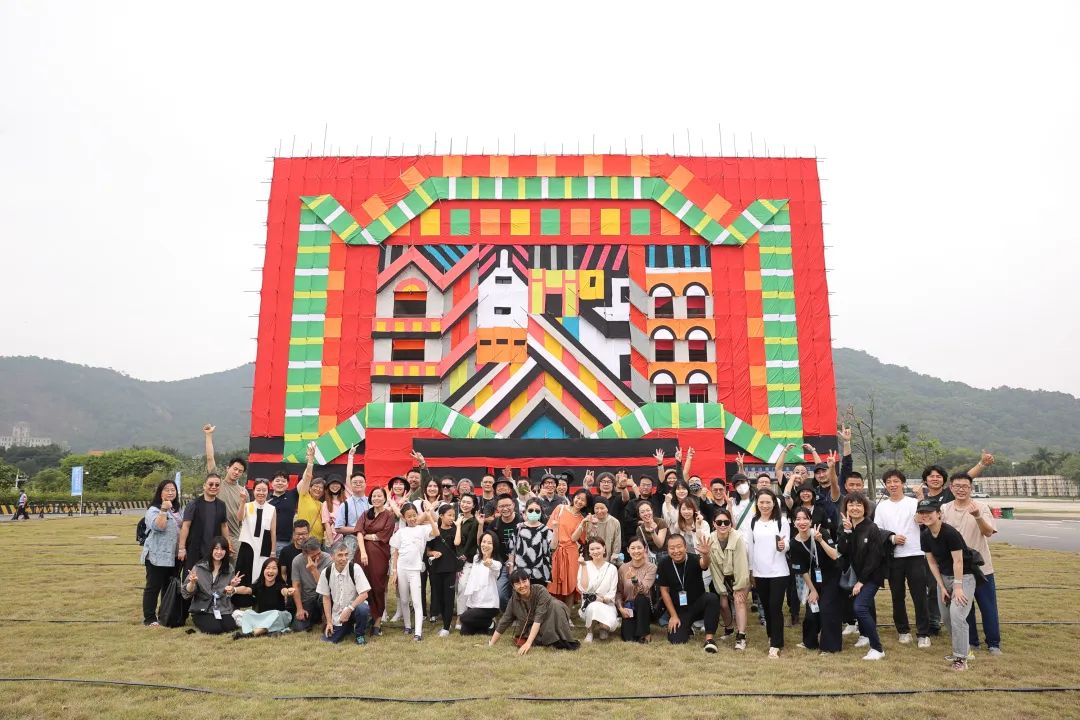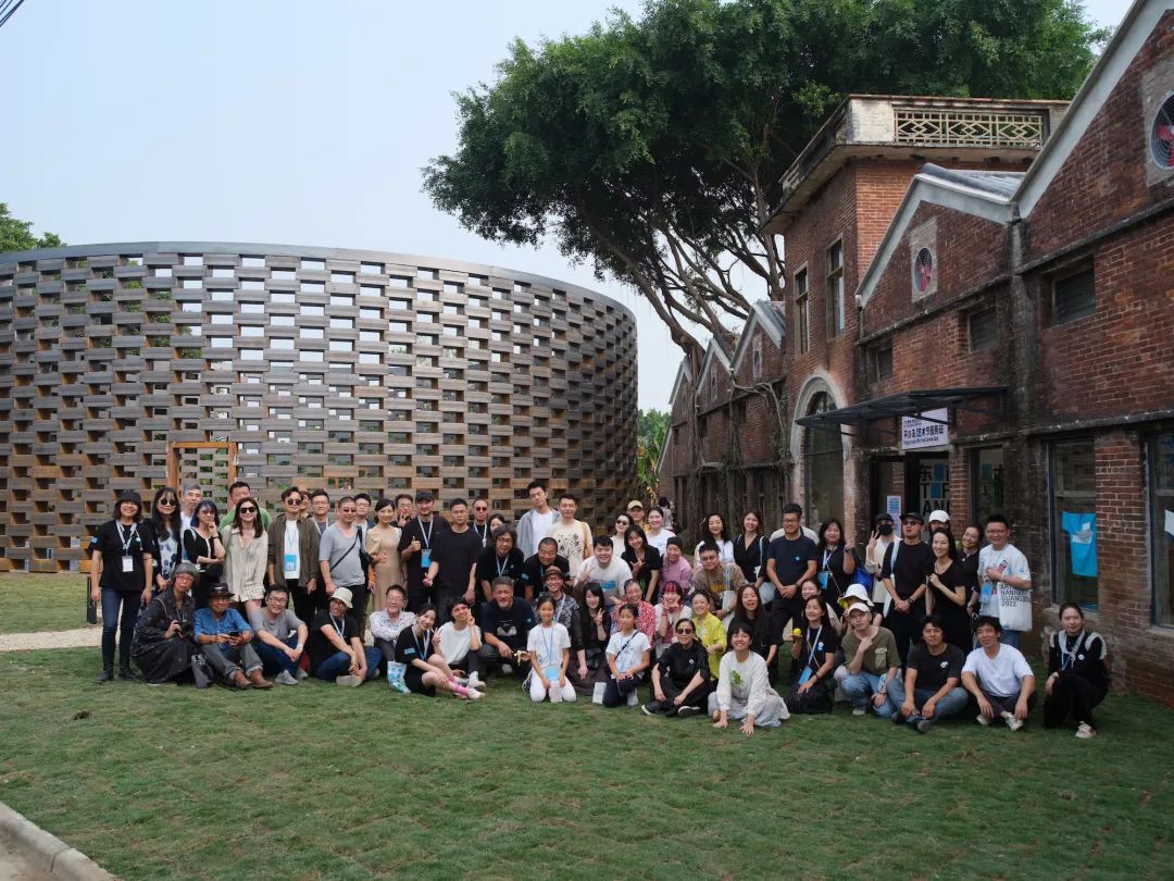 ● 首届“艺术在樵山—广东南海大地艺术节2022”开幕式艺术家与媒体在艺术项目《大戏台》《水天一色》前合影留念。