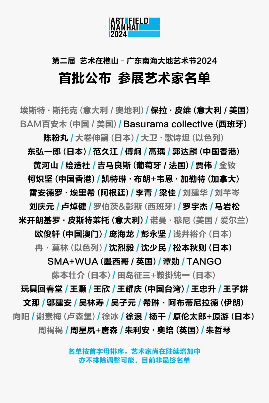 目前已确认参加第二届“艺术在樵山–广东南海大地艺术节2024”的艺术家名单(根据艺术节积累原则,名单中包含首届保留作品的艺术家)如下: