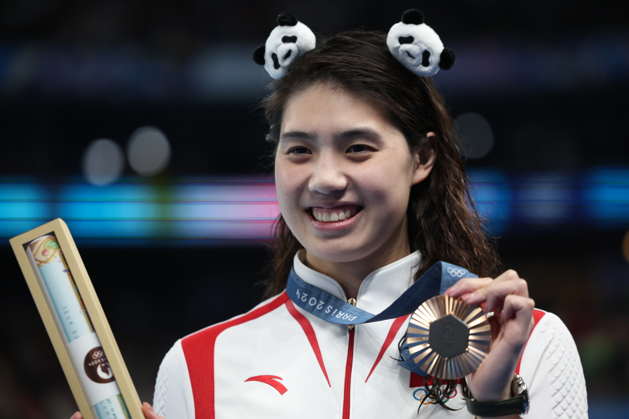 图为中国选手张雨霏头戴熊猫发饰领奖。(图片由CNSPHOTO提供)