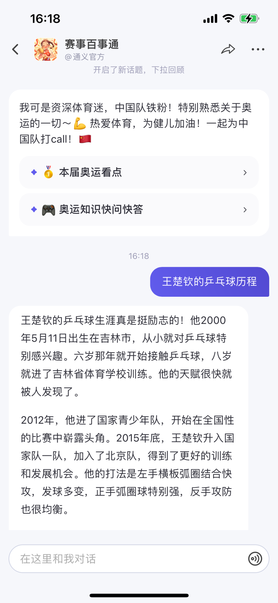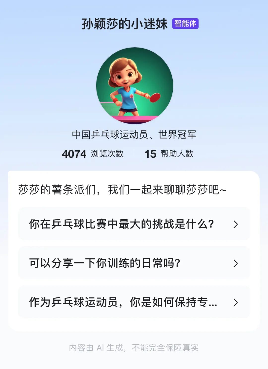 这些智能体都是由运动员粉丝创建的,不仅能和用户对话聊天,还可以回答关于运动员各类问题,比如:你在乒乓球比赛中最大的挑战是什么?可以分享一下你的训练日常吗?