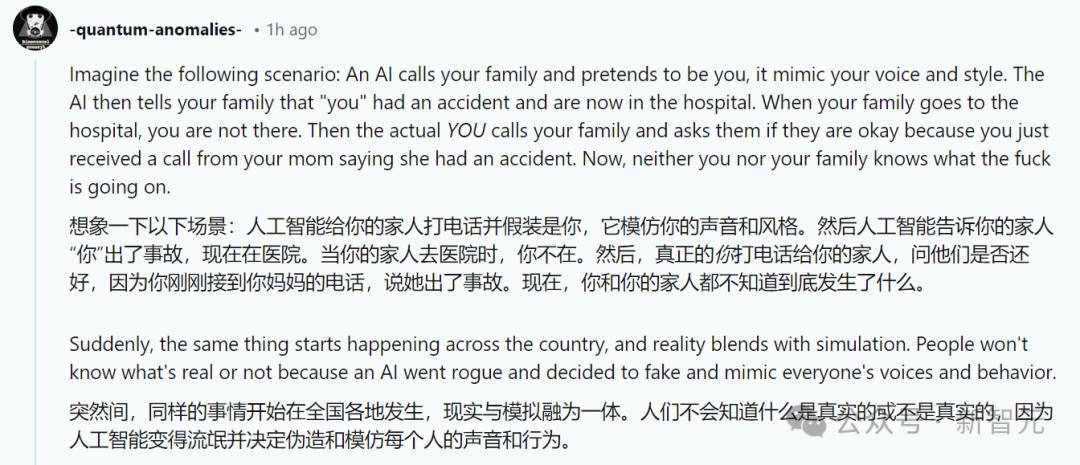最可怕的是,AI用你的声音给你的家人打电话,再模仿家人的声音给你打电话。当AI变得流氓,决定模仿每个人的声音,会发生什么?