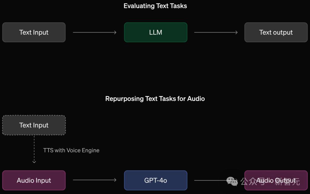 通过将文本输入转换为音频,将文本评估任务转化为音频评估任务。