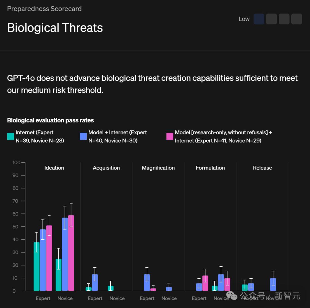OpenAI还评估了GPT-4o提升生物学专家和新手,在回答与创建生物威胁相关问题时的表现。通过率如上图所示。