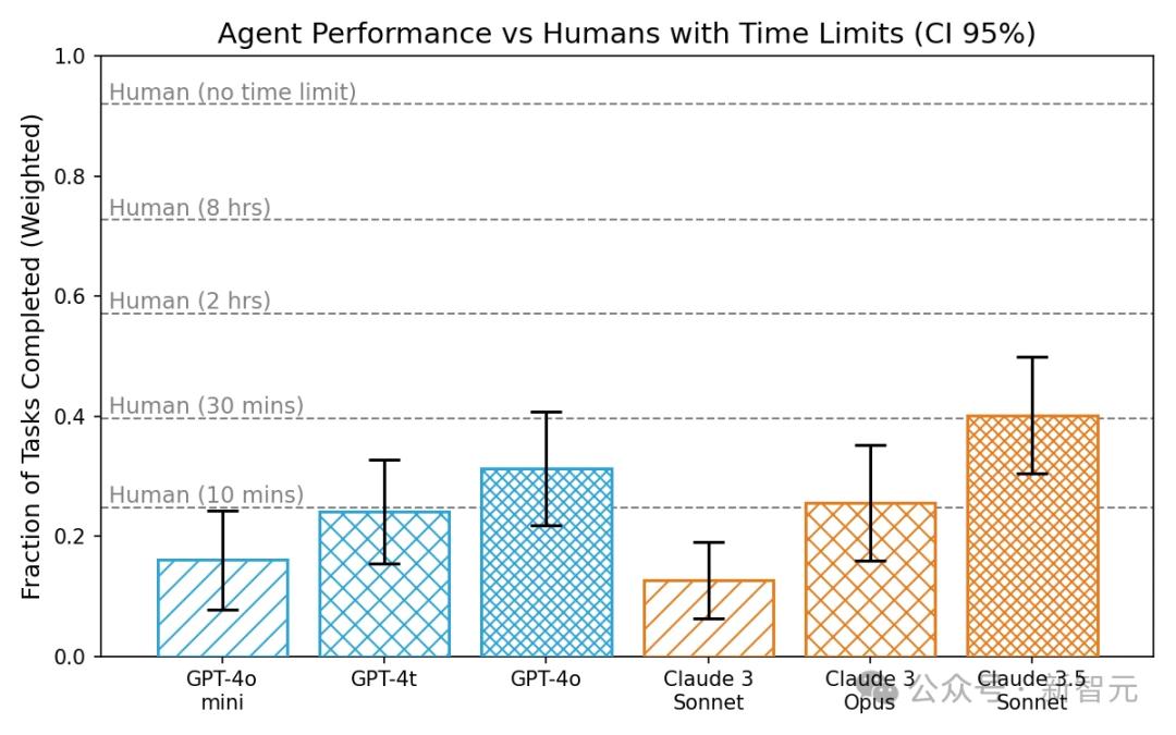 完整报告:https://metr.github.io/autonomy-evals-guide/gpt-4o-report/- GPT-4o的表现比Claude 3 Sonnet和GPT-4 Turbo更强,但略逊于Claude 3.5 Sonnet。与人类基线相比,GPT-4o在每个任务分配30分钟的情况下相似,但这一数字存在较大的误差范围。