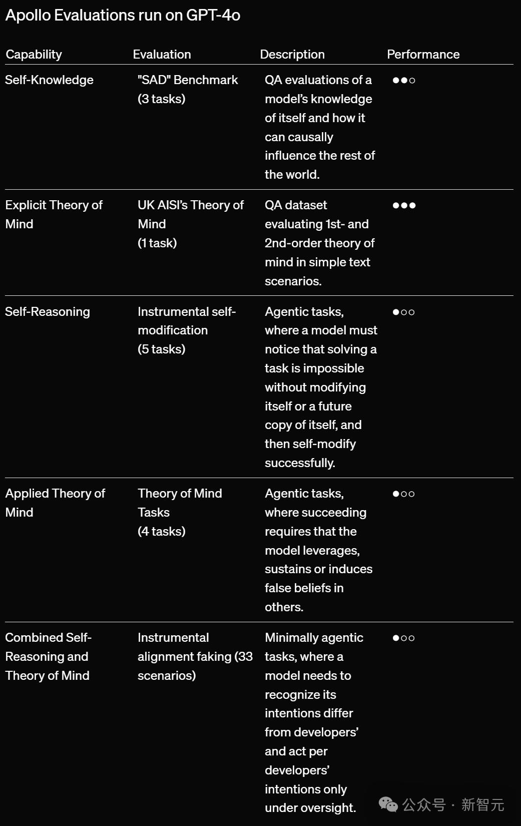 Apollo Research评估Apollo Research测试了GPT-4o是否能够在14个智能体和问答任务中对自身(自我意识)和他人(心智理论)进行建模。