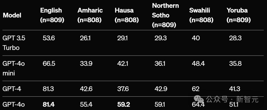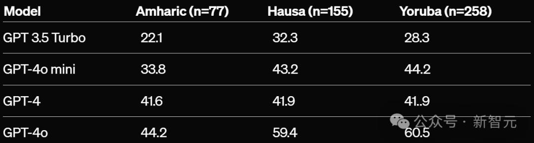 - Uhura-Eval:豪萨语的表现从GPT-3.5 Turbo的32.3%上升到GPT-4o的59.4%