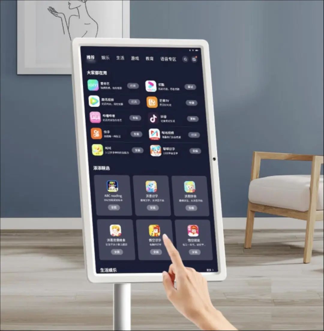 从产品层面来看,“闺蜜机”可以简单理解为一个超大号的平板电脑和一个底部带有滑轮的支架的组合。屏幕尺寸一般在20-32寸左右,分辨率大多为1080P或者4K,与一般的显示器或者小尺寸电视相当。