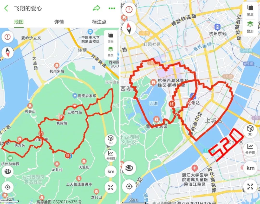 这几年七夕越过越有仪式感了,每年七夕节跑友们都会玩玩花样。除了“心心相印”“520”等西湖跑图路线,还有跑友在小区楼底下跑个步、告个白,也是不错的选择。杭州人真的太懂浪漫了