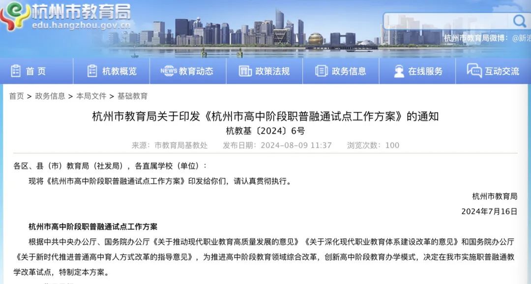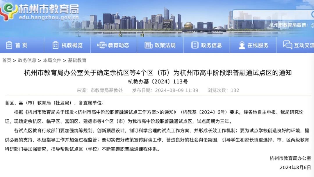 8月9日,杭州市教育局发布《杭州市高中阶段职普融通试点工作方案》,并确定余杭区、临平区、富阳区、建德市等4个区(市)为杭州市高中阶段职普融通试点区,试点周期为三年。