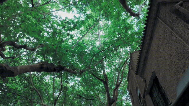 在浓密的梧桐叶下