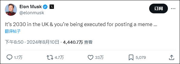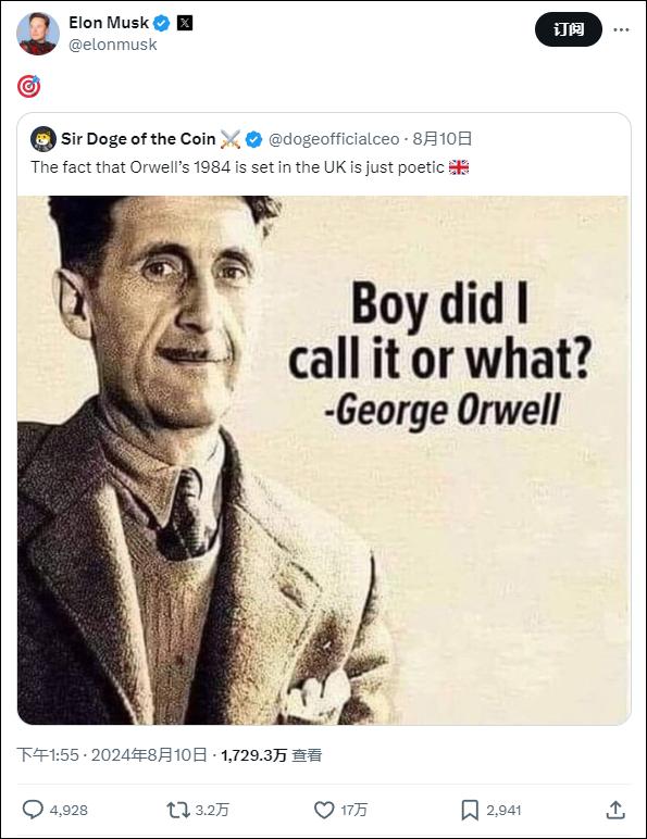 当被问及伦敦警方是否计划起诉来自其他国家社交媒体上的发帖者时,罗利回答说:“做一个‘键盘侠’并不会让你免受法律的制裁”,并指名道姓地指出,“像马斯克这样的人”可能会成为潜在的调查目标。不过,马斯克也不是什么“善茬”,此后依旧在X平台大量发布和转发抨击帖文,甚至直接讽刺英国政府是著名作家乔治·奥威尔那部《1984》笔下的“极权主义独裁政府”。