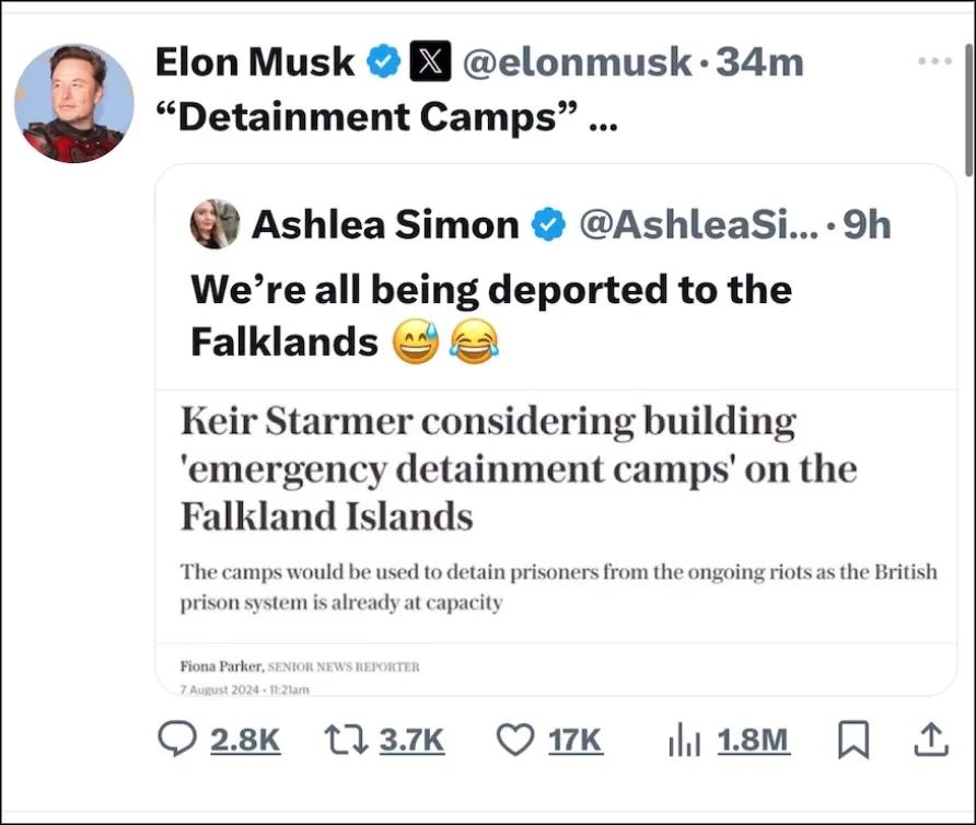 就在马斯克与英国新上台的工党政府就此次暴力骚乱事件发生交锋之际,马斯克当地时间8月8日还在X平台转发了一篇《每日电讯报》的文章,其中内容声称,英国首相斯塔默正考虑将极右翼暴徒送往马尔维纳斯群岛(马岛,英国称“福克兰群岛”)上的“紧急拘留营”。
