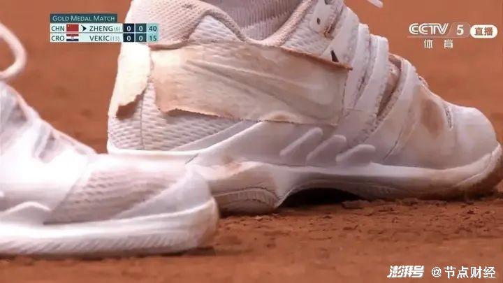郑钦文本来穿的是一双耐克的vapor x,按说应该换成阿迪的新球鞋。但是,因为网球鞋需要和运动员进行磨合,不可能临阵换鞋,所以她仍然穿着耐克的鞋,但不能露出耐克的LOGO。