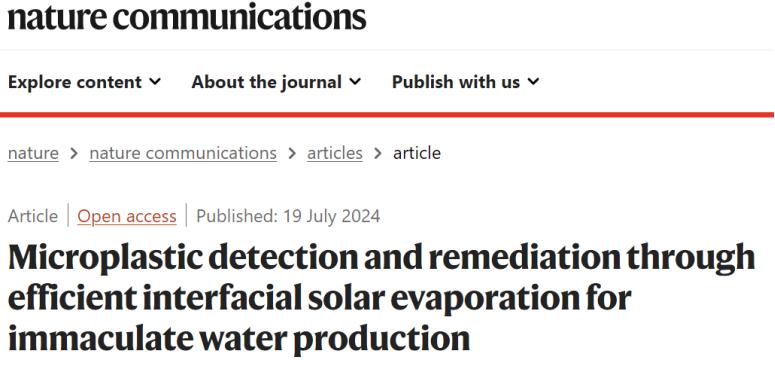 [1]Yu, Z., Li, Y., Zhang, Y. et al. Microplastic detection and remediation through efficient interfacial solar evaporation for immaculate water production[J]. Nature Communications, 2024.