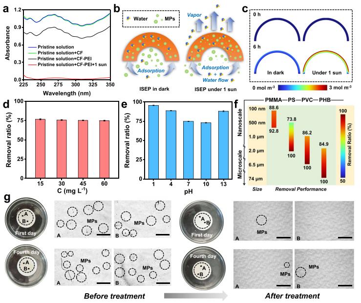 a. 紫外可见光谱图;b. 太阳能蒸发平台去除微塑料机理图;c. COMSOL模拟的微塑料去除率;d. 不同浓度的微塑料与去除率的关系图;e. 不同pH值的微塑料与去除率的关系图;f. 不同类型的微塑料与去除率的关系图;g. 水溶液中微塑料在不同时间的显微图像。图片来源:参考文献[1]3